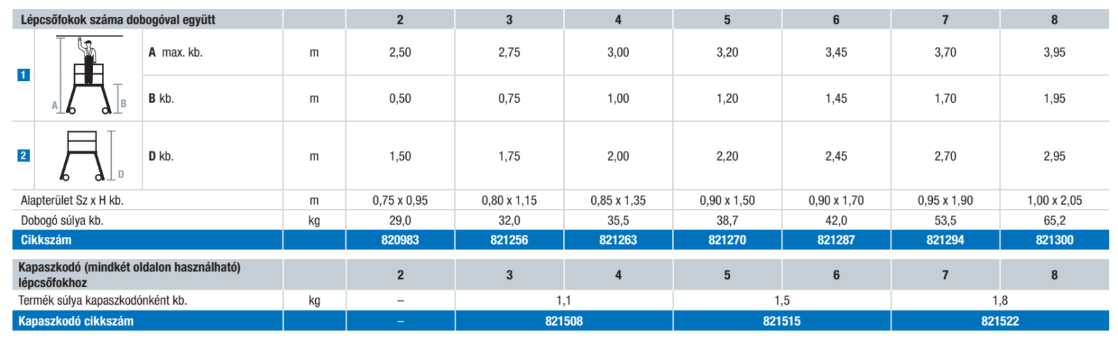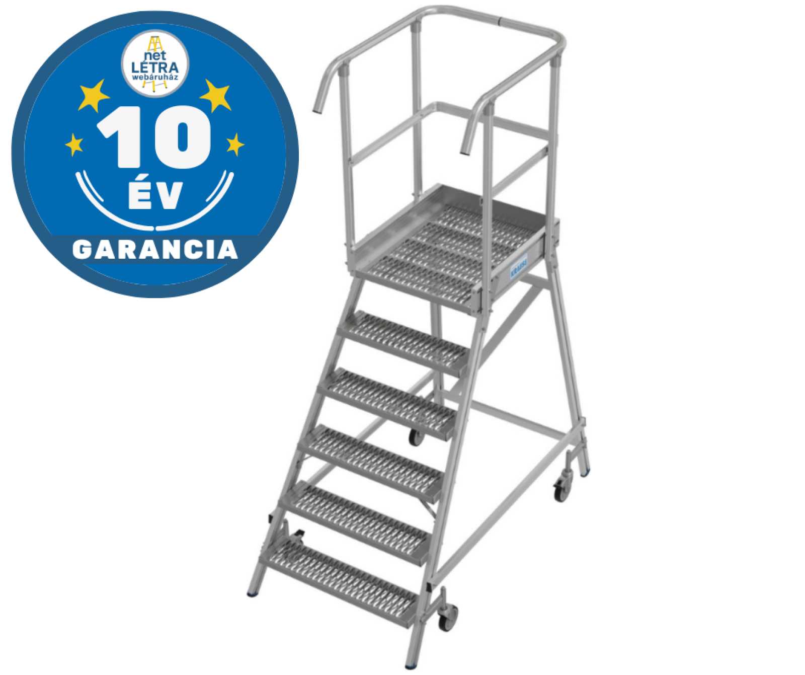 - Egy oldalon járható gurítható alumínium dobogó 180 mm mély lépcsőfokokkal és nagy állófelülettel R13 csúszásmentes profilrácsból, amely körbefutó dobogókorláttal van felszerelve a biztonságos és kényelmes munkavégzés érdekében