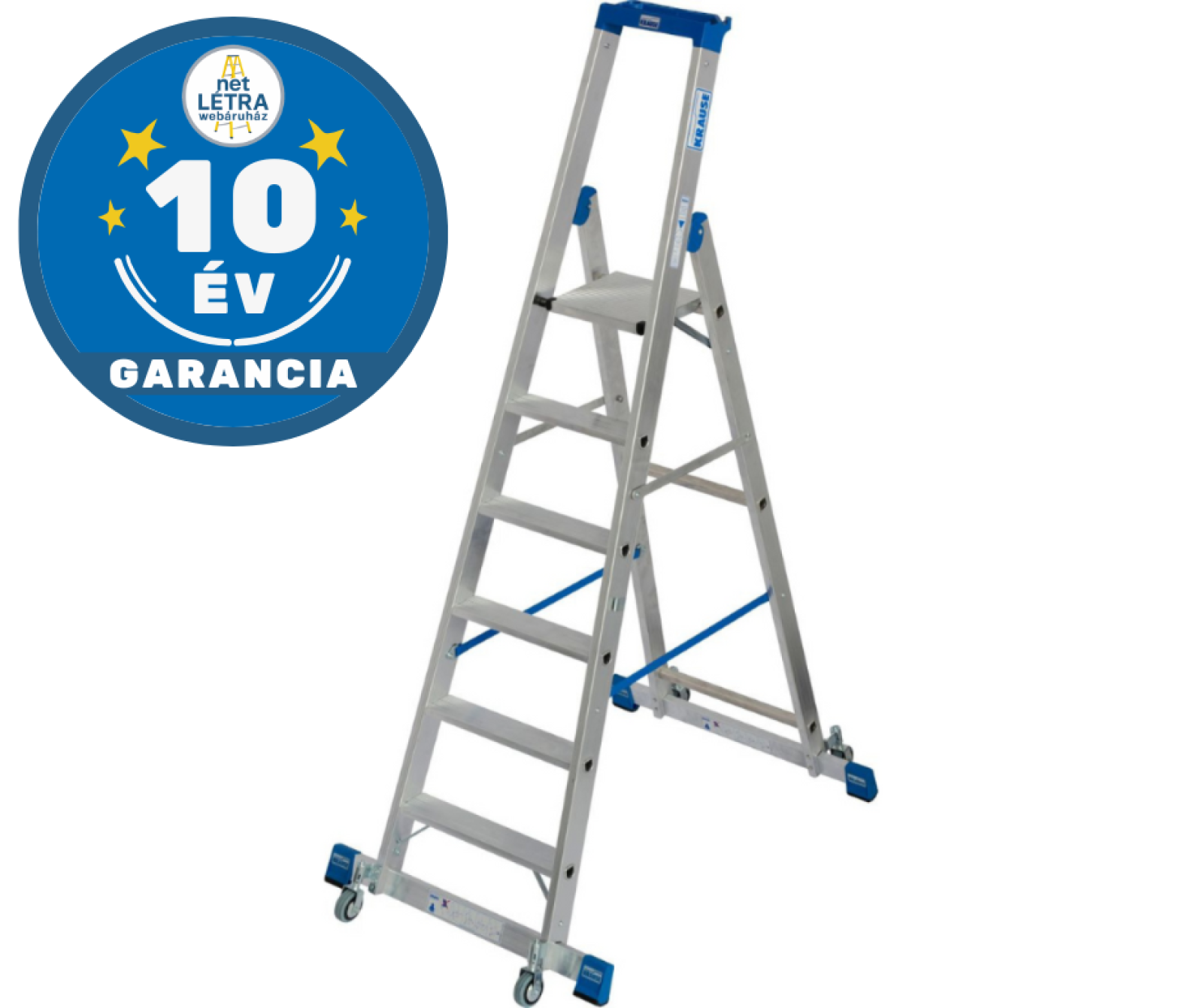 Krause robosztus, gurítható alumínium állólétra ( profi háztartási létra ) kitámasztóval melynek segítségével megoldott az egyszerű helyváltoztatás és nagyfokú biztonság, praktikus tárolótálcával ellátva a professzionális használat érdekében.