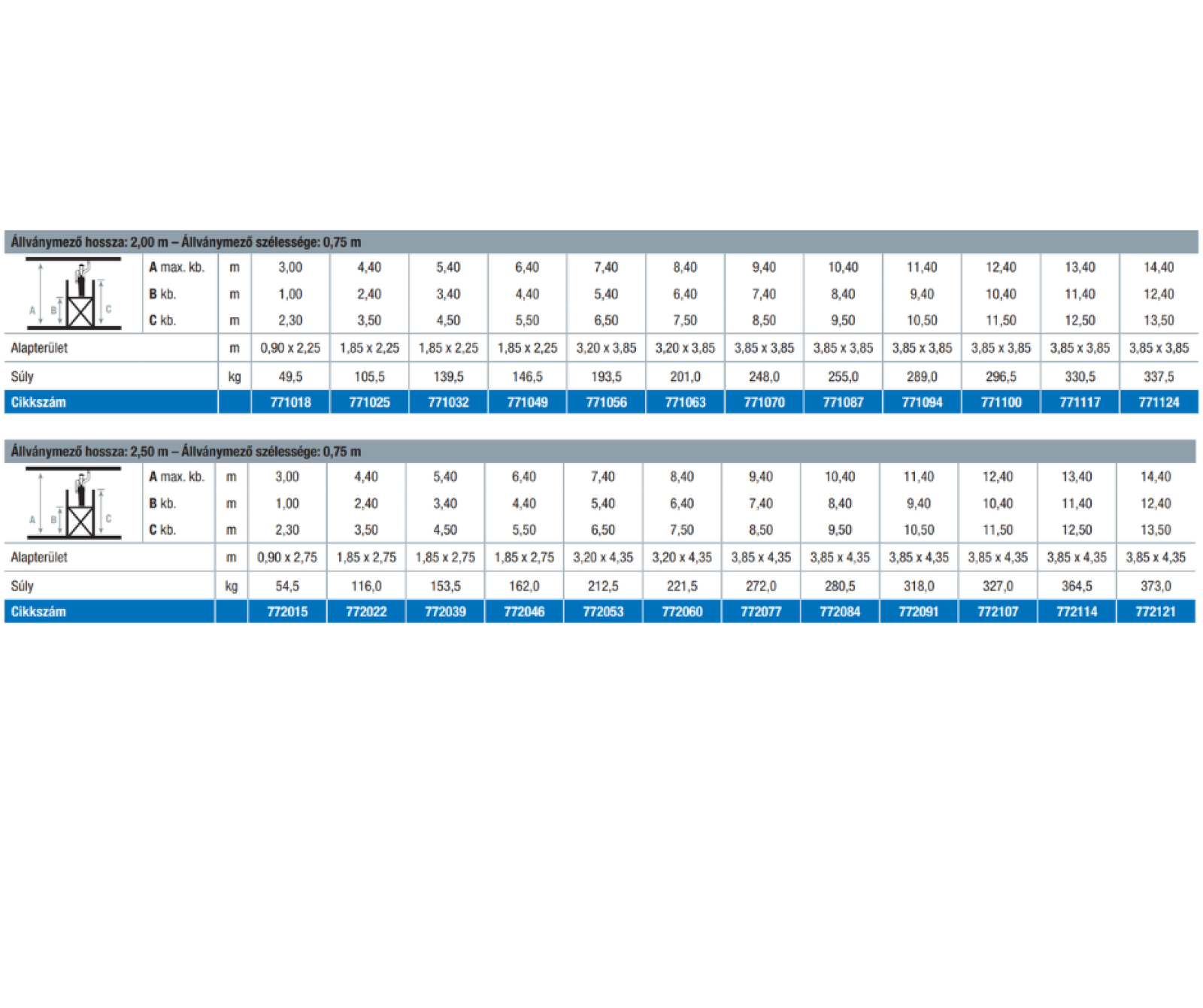 - Állványmező szélessége: 0,75 m